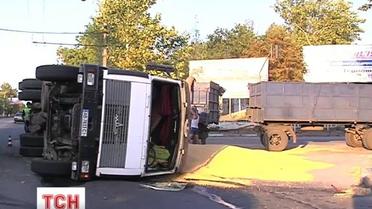 В ДТП никто не пострадал, а вот улицу полностью засыпало зерном. Рассыпанная кукуруза более чем на час парализовал проезд, поэтому ее срочно начали убирать лопатами. Виновником аварии стал водитель грузовика. Он ехал на большой скорости и не справился с управлением. В полиции говорят, что тот был пьян.