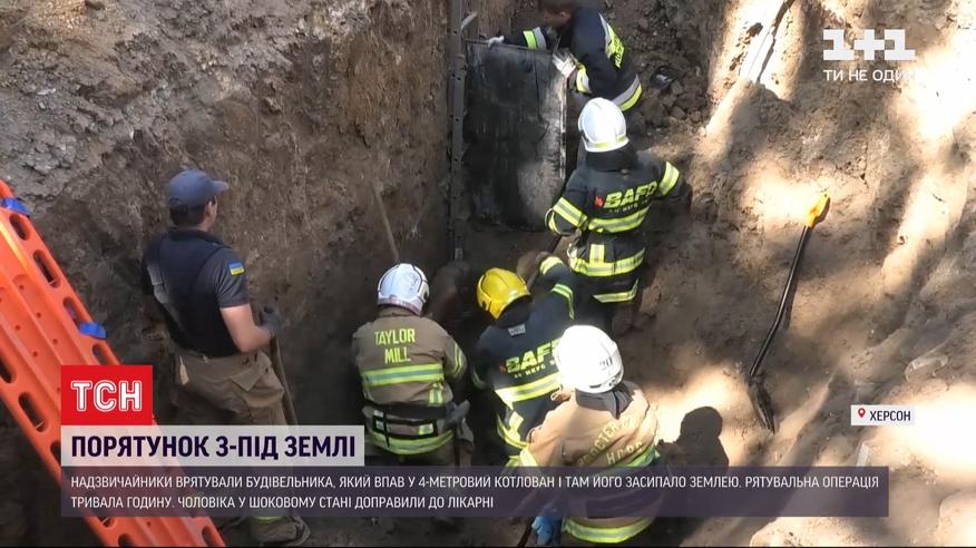 В Херсоне спасатели извлекли из-под земли мужчину, который пробыл там около 15 минут. На строительстве рабочий провалился в 4-метровый котлован, а затем его засыпало землей. Свидетелями происшествия стали его коллеги, которые вызвали спасателей и указали примерное местоположение человека. Верхний, полутораметровый слой почвы сняли экскаватором. А руками выкопали голову потерпевшего. Затем постепенно освободили все тело. Ногу мужчины зажало лестницой. Все это время пострадавший в шоковом состоянии сидел неподвижно, смог только пожаловаться на боль в груди. В сидячем положении, так, как он был под землей, строителя положили на носилки и, с подозрением на переломы, доставили в больницу. Спасательная операция длилась час, было задействовано 16 человек и 2 единицы техники.