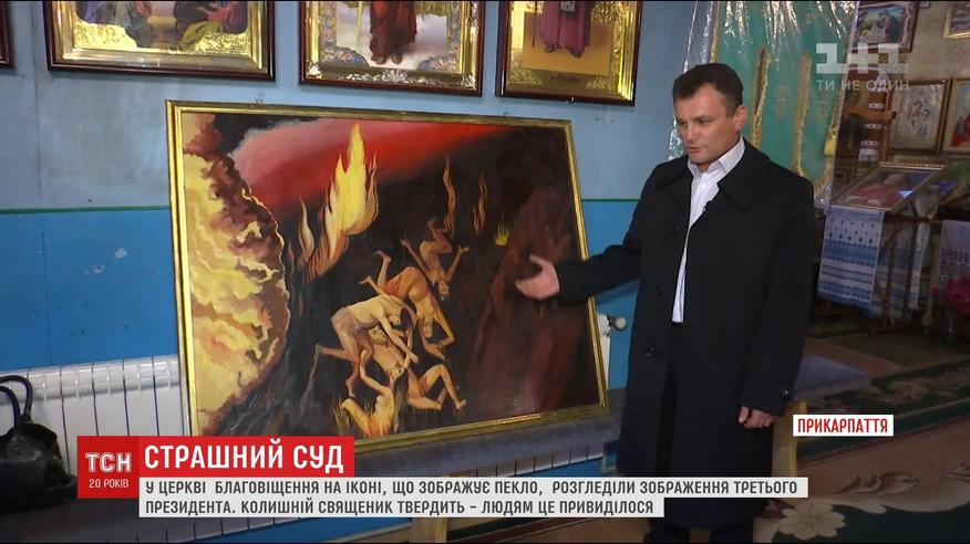 Люди вроде увидели на иконе бывшего президента. Все бы ничего, но на ней Ющенко находится в аду среди голых женщин. Странная икона висела на видном месте в церкви, которая до недавнего времени принадлежала московскому патриархату. Священники уверяют, что Ющенко на иконе людям мерещится.