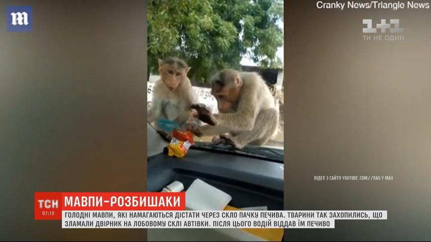 Обезьяны, которые пытаются украсть еду через стекло автомобиля. Это видео сняли в Индии. Две обезьяны увидели пачку печенья и пытались ее достать. Но не сразу поняли, что между ними и добычей прозрачное стекло. Поэтому, начали его царапать и облизывать пока не сломали дворник. Далее водитель решил не ждать, открыл окно и бросил животным печенье.