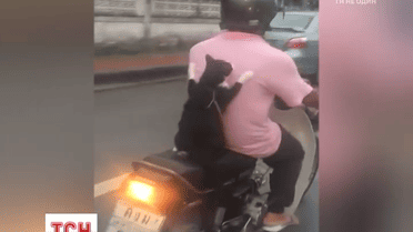 Чтобы домашний любимец по имени Талок не унывал дома, хозяин каждое утро сажает его на скутер и везет в школу, где работает охранником. Котик за спиной водителя ведет себя вполне по-человечески, хотя и без шлема, и держится передними лапами за спину хозяина.