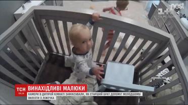 Камеры в детской комнате зафиксировали, чем занимаются дети, когда их никто не контролирует, и как старший мальчик помог младшему вылезти из кроватки. На видео видно, сначала он преподносит брату стульчик, перебрасывает его через бортик кровати, сам залезает туда. Показывает, каким образом им можно воспользоваться. А уже потом помогает малышу выбраться наружу.