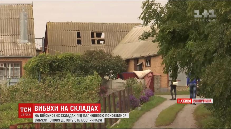 Взрывы на складах боеприпасов под Калиновкой возобновились. По свидетельствам корреспондентов ТСН боеприпасы детонируют раз в 20-30 минут. И это не разминирования, а именно детонация поврежденных боеприпасов. Спасатели сообщили, что в селах, которые попали в зону разлета снарядов полностью выгорели 7 домов, выбиты стекла и повреждены стены и крыши. Сам пожар локализовали. Часть эвакуированных людей желает вернуться в свои дома немедленно. Но утром дорогу к Калиновки было перекрыто.