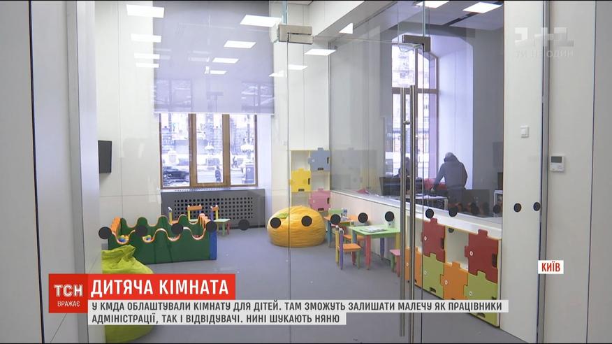 В столичной администрации обустроили детскую комнату и теперь подбирают человека, который бы ухаживал за детьми посетителей и работников. Комната - с бассейном с шариками, телевизором и за стеклом. Это, чтобы родители могли видеть своих малышей, пока решают вопросы.