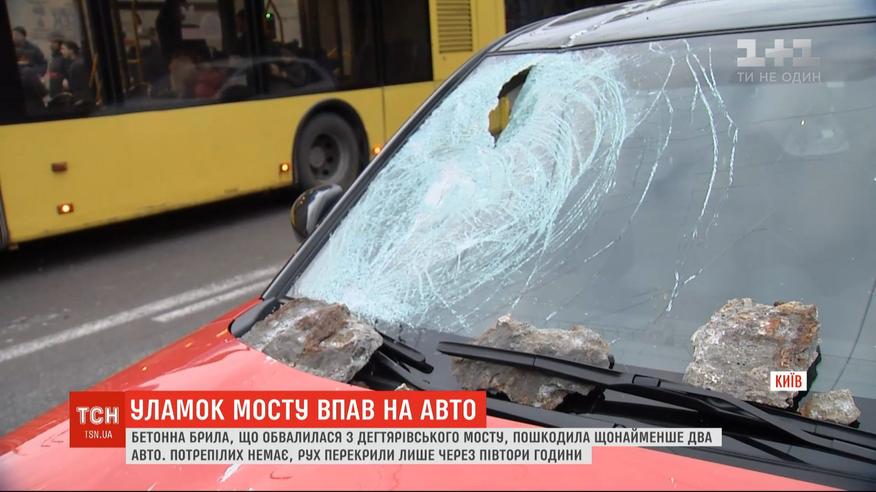 В Киеве куски от Дегтяревского моста обрушились на машину