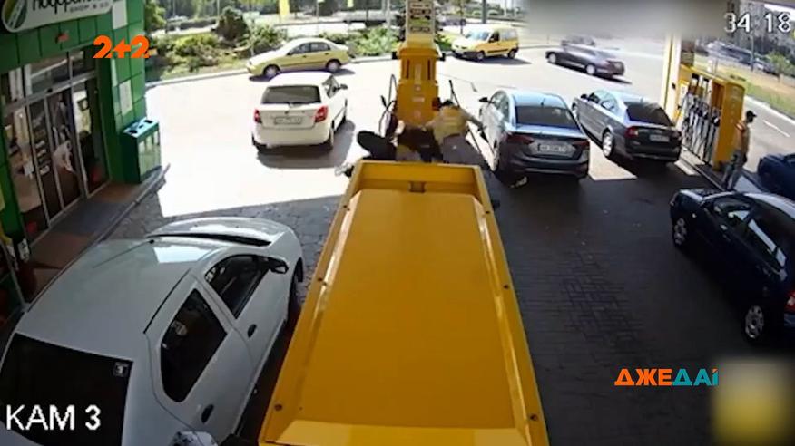В столице мужчина захотел научиться ездить на скутере. Как тренировочную площадку он выбрал АЗС. Однако, урок провалился уже с самого начала. Сначала мужчина заехал в припаркованный БМВ, а затем – уже неуправляемый мотоцикл на полном ходу снес заправщика. Для него приключение завершилась тяжелыми травмами и поездкой в больницу. Полные выпуски смотрите на 1+1 video