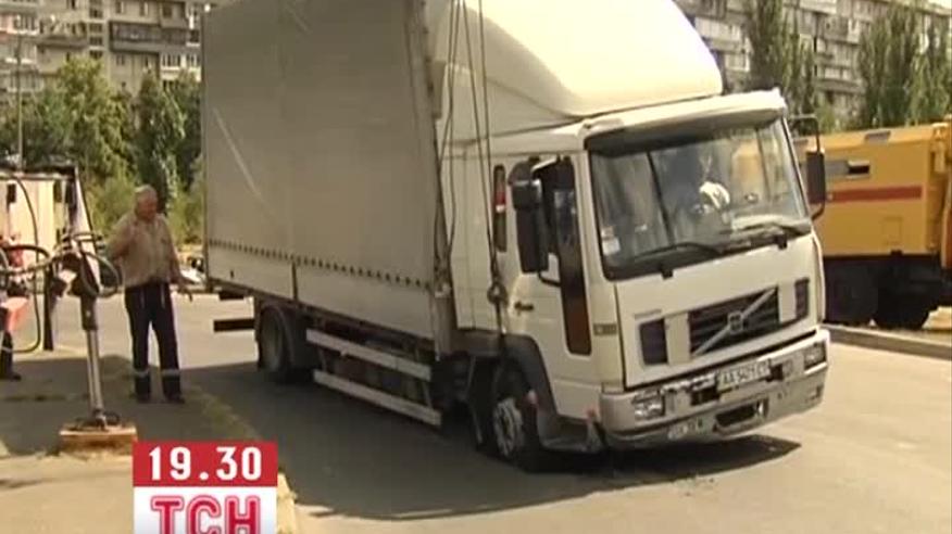 В Киеве на Русановке грузовик на ходу застрял в асфальте