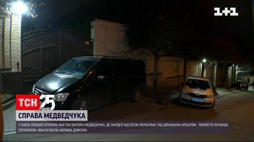 В Киеве полиция оцепила имение Медведчука, где нардеп ОПЗЖ находится под домашним арестом. Прилегающую улицу перекрыли, обыскивали вокруг. По данным Следствия Инфо, правоохранители прибыли в дом, так как получили информацию о подозрительной активности. Днем отсюда, якобы, неизвестные автомобили вывозили имущество депутата, в том числе бронежилеты и оружие.