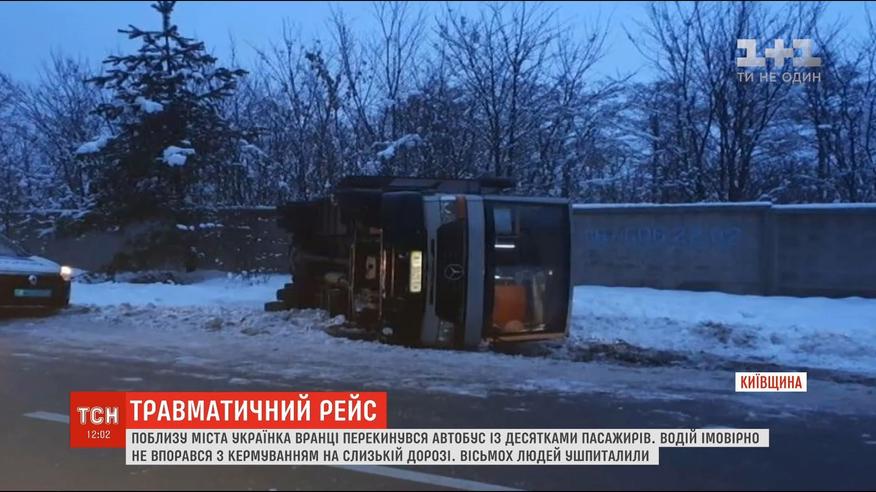 Все произошло около семи утра возле города Украинка. По данным полицейских через скользкий путь водитель не справился с управлением и слетел на обочину. В салоне находилось 30 человек. Восемь получили телесные повреждения. Их госпитализировали, но жизни говорят врачи ничто не угрожает.