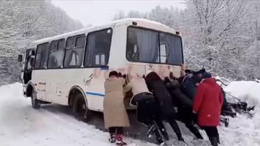 На Закарпатье женщины вытолкали рейсовый автобус, застрявший в сугробах снега. Пассажиры решили не ждать помощи и справились самостоятельно. На записи видно, что около 10 женщин вместе толкают большой автомобиль. Источник: Варта Закарпаття