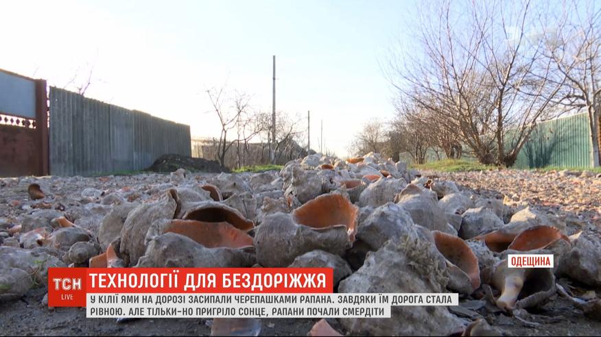 В Килие ямы на дороге засыпали ракушками рапана, которые воняют из-за теплой погоды