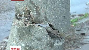 Несколько дней назад в него врезался автомобиль и перебил пополам так, что верхняя часть железобетонной конструкции повисла в воздухе.