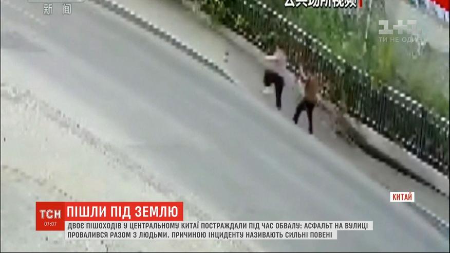 В Китае двое пешеходов провалились под землю вместе с тротуаром
