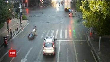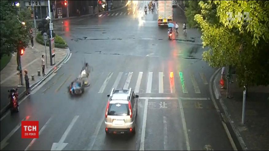 В Китае мотоциклист и велосипедист попали в впечатляющую аварию
