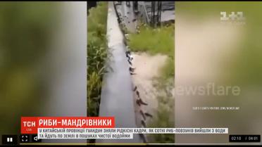 В Китае сняли редкие кадры, как сотни рыб передвигаются по земле в поисках более чистого водоема