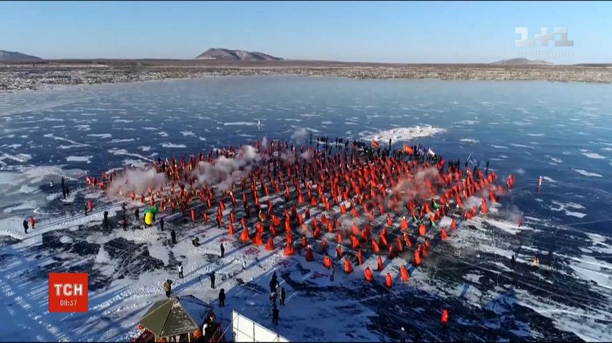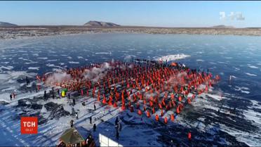 Правда, гребли не на воде, а на льду. Коррективы в традиционные соревнования на воде внесла погода. Сейчас температура в провинции Хэйлунцзян - минус 30 по Цельсию. Озеро замерзло, поэтому некоторым пришлось впервые "плыть" по льду.