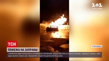 Врезался в заправку, загорелся и погиб. В Кременчуге уже около 9 часов тушат пожар на АЗС. Водитель микроавтобуса не справился с управлением и влетел в цистерну с газом. Загорелись и емкость, и авто. По данным ТСН, водитель погиб, а укротить пламя пытаются почти 30 пожарных. Причины аварии еще предстоит выяснить экспертам.
