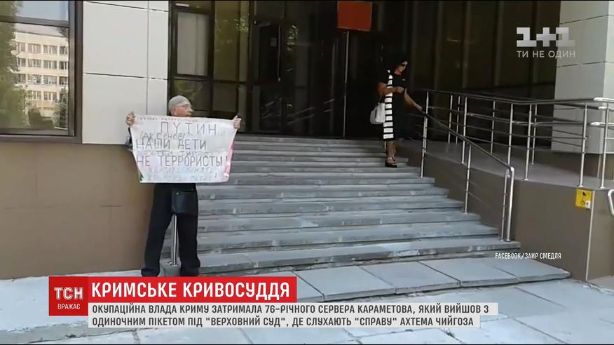 76-летний Сервер Караметов вышел с одиночным пикетом под так называемый Верховный суд, где продолжается судилище над заместителем председателя Меджлиса Ахтемом Чийгозом. Дедушку сразу окружили четверо полицейских с требованием прекратить пикет. Затем схватили старого за руки и затолкали в машину. Несколько часов мужчину, страдающего болезнью Паркинсона, держали в отделении, не давая возможности принять лекарства и сходить в туалет.