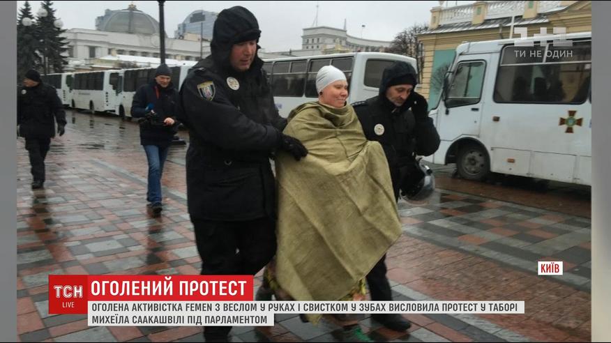 Утром палаточный городок возле Верховной Рады посетила гола активистка с веслом в руках, свистком во рту и нецензурными надписями на животе. Акция продолжалась недолго. Модель скрутили полицейские и прикрыли, чтобы она совсем не замерзла. В Киеве сегодня ноль и мокрый снег.