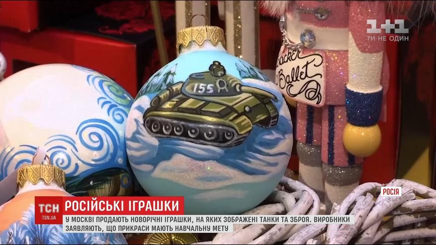 Набор игрушек для елки, в который также входят шарики с военным самолетом, истребителем и ружьем, назвали "Наши традиции". Продают их в крупнейших супермаркетах и элитных магазинах российской столицы по 35 долларов за штуку.