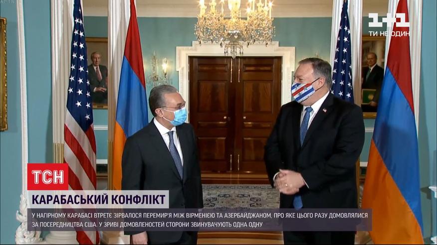 В третий раз сорванное перемирие. Сегодня утром Армения и Азербайджан должны были прекратить обстрелы в Нагорном Карабахе. Впрочем, обе стороны снова обвиняют друг друга в срыве договоренностей. О перемирии страны на этот раз договаривались при посредничестве США. Соглашения достигли на встречах госсекретаря Майка Помпео с министрами иностранных дел. Две предыдущие попытки установить режим прекращения огня тоже провалились.