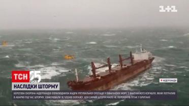 Береговая охрана Нидерландов обнародовала кадры спасательной операции. Во время мощного шторма в Северном море они выпустили из грузового корабля 18 членов экипажа. При сложных погодных условиях судно попало в аварию - грузовой корабль налетел на перевозивший горючее танкер. И перестал слушаться руля. Так что экипаж пришлось освободить, корабль сейчас находится в Северном море.