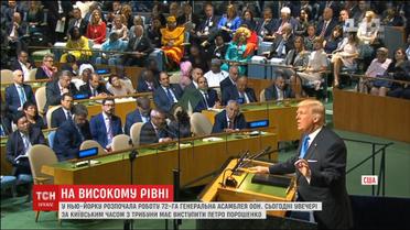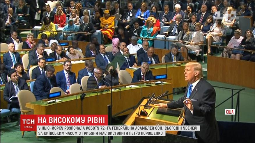 Сегодня вечером по киевскому времени с трибуны выступит Петр Порошенко. А уже завтра, в четверг, в кулуарах ассамблеи он встретится с американским руководителем Дональдом Трампом. Президент США уже выступил с речью на Генассамблее. Вспомнил Украину и подчеркнул важность защищать суверенитет государства.