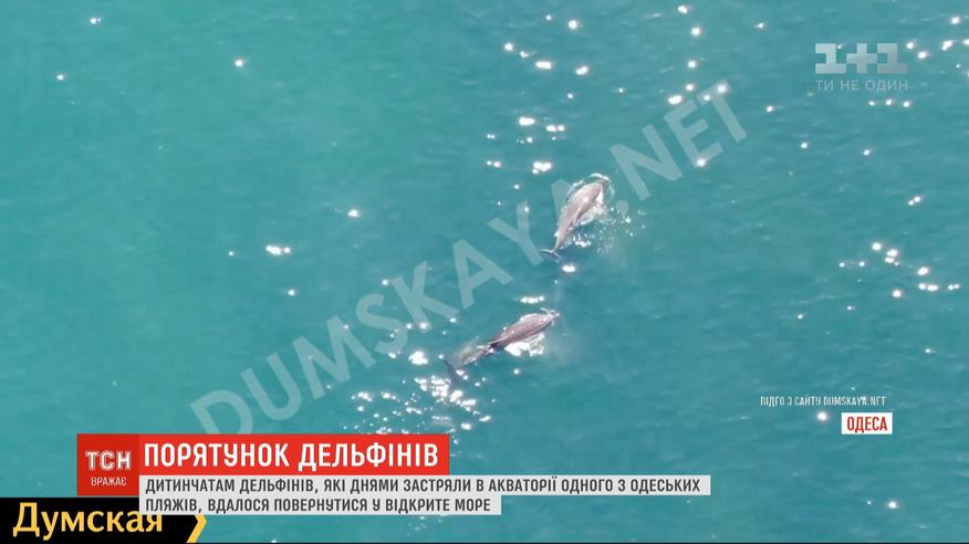 В Одессе детенышам дельфинов, которые застряли в акватории пляжа, удалось выбраться в открытое море