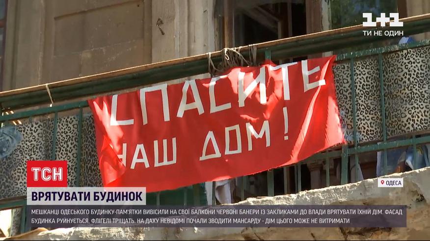 "Спасите наш дом!" В Одессе жители старинного дома-памятника массово вывесили на свои балконы красные баннеры с этим призывом. Призывают власти, чтобы те обратили внимание на состояние здания. Фасад разрушается, флигели трещат, да еще и неизвестные начали возводить на крыше мансарду. Люди опасаются, что перепланировка приведет к падению дома.