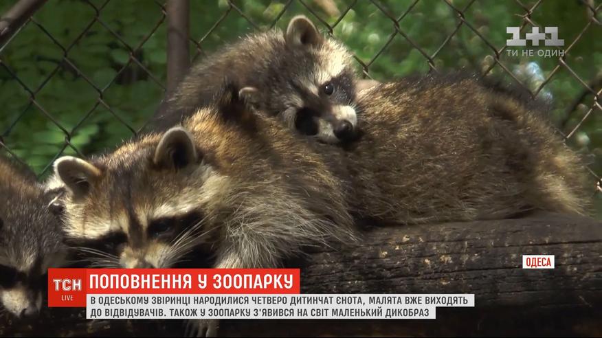 Полосатое пополнение в одесском зоопарке. В семье енотов родилось сразу четверо детенышей - двое мальчиков и две девочки. Малыши уже смело выходят на смотрины - мама выводит их в общий вольер показать посетителям. В зверинце появилось на свет и малыш дикобраза.