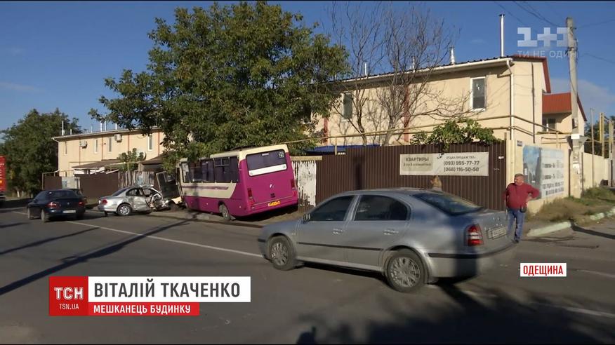 Автобус рейса Черноморск-Одесса ехал по главной дороге. В это время легковушка выезжала со второстепенной. Свидетели говорят, что выскочил перед автобусом на большой скорости. Водитель маршрутки, чтобы избежать столкновения и не выехать на встречную полосу, был вынужден направить автобус в сторону жилого дома. Но столкновения машин таки произошло. Обе влетели в забор. Пострадали 5 человек.
