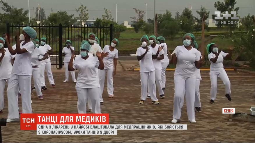 В одном из госпиталей Кении решили поднимать настроение медработников уроками танцев. 2-часовые занятия с зумбы проводят прямо во дворе больницы. Танцуют с соблюдением всех карантинных правил - и дистанцию держат, и защитные средства не снимают, даже если очень вспотели.
