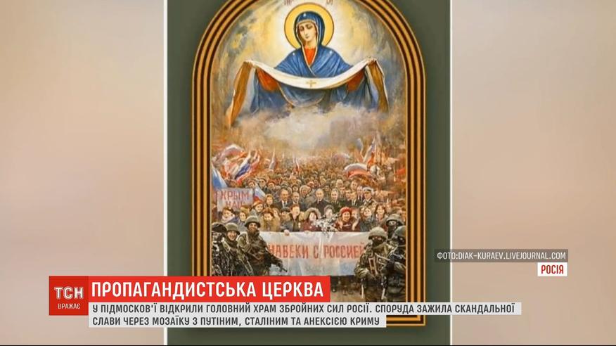 Пропагандистская церковь. В Подмосковье открыли главный храм Вооруженных сил России, хотели "украсить" изображениями Путина, Сталина и иллюстрациями аннексии Крыма. Освящал церковь лично российский патриарх Кирилл, объявил себя настоятелем храма. Участие в мероприятии приняли сотни военных, одетых в форму времен Второй мировой.