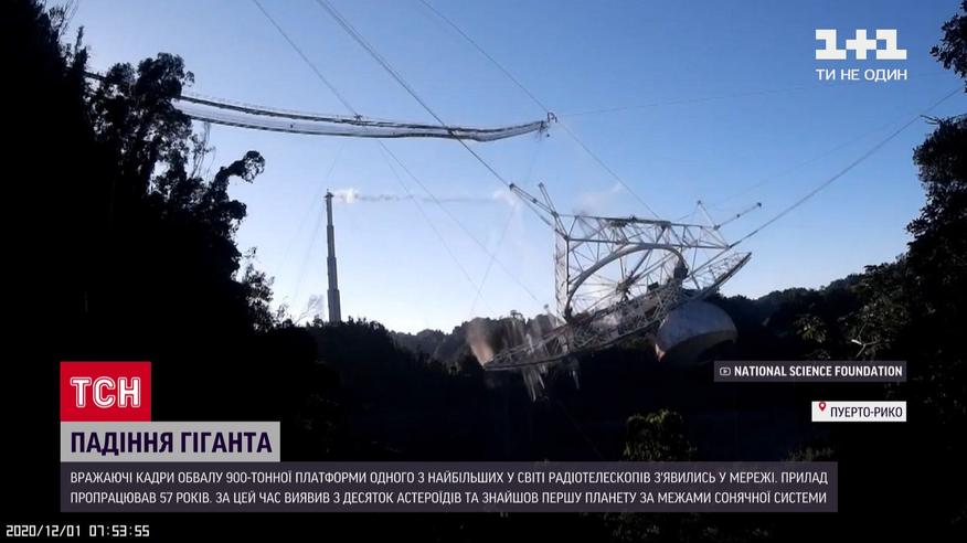 Впечатляющие кадры обвала 900-тонной платформы одного из крупнейших в мире радиотелескопов появились в сети. Считанные секунды - и гигантский телескоп разбивается о землю в Пуэрто-Рико. "Аресибо" проработал 57 лет. За это время обнаружил с десяток астероидов и нашел первую планету за пределами Солнечной системы. Этим летом на антенне "Аресибо" образовалась гигантская трещина. Всю обсерваторию поэтому закрыли. Однако телескоп разрушался дальше.