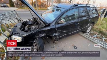 Тройное ДТП в Ровно. Там машина вылетела на встречную, на скорости протаранила другую легковушку так, что она от удара перевернулась, потому влетела еще в одно авто, а остановили ее только светофор и металлический забор. Виновник как раз въезжал в город с трассы и заехал на встречку, где двигались две машины. В результате пострадали семь человек. Среди них трое детей.