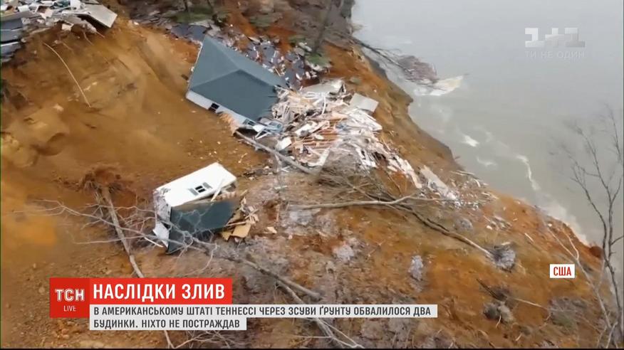 В американском штате Теннесси в результате наводнений снесло часть обрыва. Высокая вода размыла почву и холм обвалился. Полностью уничтожено два жилых дома. Никто не пострадал. О непогоде и возможном обвале хозяев предупредили спасатели.