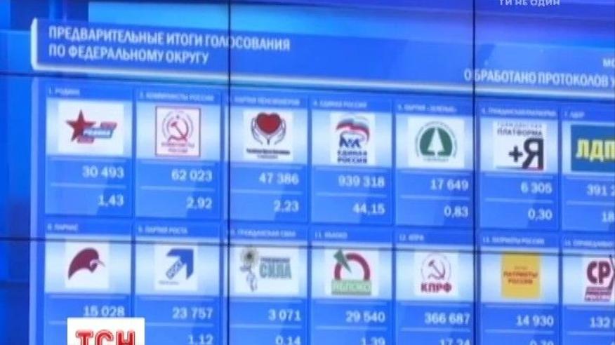 По данным системы "Выборы" при обработке 80% проколов партия Путина-Медведева "Єдина Росія" набрала более 54%, второе и третье место поделили ветераны российской политики КПРФ Зюганова и ЛДПР Жириновского - у них по 13%. Также преодолевает 5% проходной барьер "Справедлива Росія" - у нее более 6%.