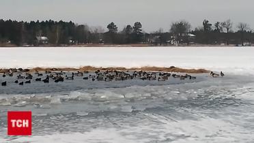 Десятки водоплавающих птиц могли погибнуть на озере Островское, Ровенской области. Водоем сковал лед и пернатые оказались в небольшой проруби без доступа к пище. Местные вызвали к озеру работников Нобельского природного нацпарка. Они на лодке подобрались ближе к птицам, порубили лед и очистили прорубь от льда, чтобы она стала шире. Стелили пернатым сена и насыпали зерна для подкормки. Детали – в ТСН.