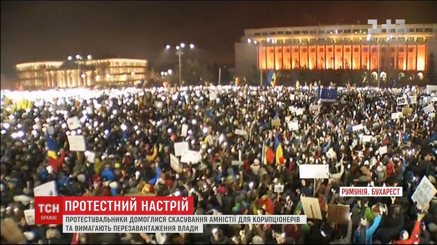 За неделю бурных протестов правительство все же отменило поправки в Уголовном кодексе, которые амнистировали коррумпированных и уже осужденных за это чиновников. Это людей уже не успокаивает. Люди и сегодня собираются выходить на улицу в семь вечера. Теперь народ требует отставки правительства. Таких больших демонстраций Бухарест не видел 25 лет.