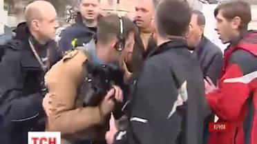Журналисты пытались снять, как так называемая "самооборона" Крыма грузовиком Урал таранит ворота украинской части. В считанные секунды все камеры и фотоаппараты разбили, а их самих жестоко избивали ногами, говорят журналисты.