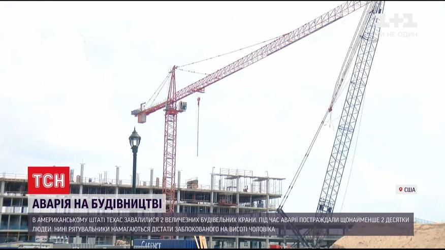 Авария на стройплощадке. В американском штате Техас столкнулись 2 гигантских строительных крана. Пострадали минимум 2 десятка человек. Большинство из них уже увезли в больницы. На месте аварии сейчас активно работают спасательные подразделения. Ведь один из строителей сейчас заблокирован в кабине крана на высоте в 45 метров.