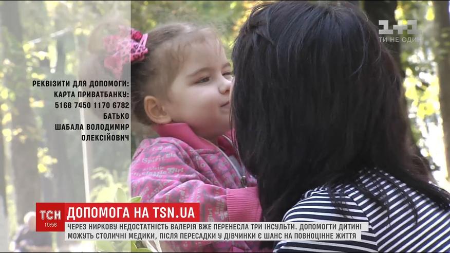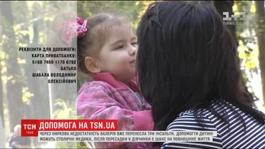 Маленькая девочка уже перенесла три инсульта, и сейчас ей нужна пересадка почки. Болезнь одолела ребенка с первых дней рождения и теперь он полностью зависит от аппарата гемодиализа. Донором почки может стать мама Валерии. Стоит такая операция в Украине - более 200 тысяч гривен, такую сумму семья самостоятельно собрать не может.