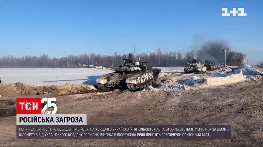 Несмотря на заявления России об отводе войск, на границе с Украиной их количество наоборот увеличивается. Ссылаясь на источники в Белом доме, американская пресса пишет о дополнительных семи тысячах военных. В Беларуси, на реке Припять, менее чем в десяти километрах от украинской границы россияне развернули понтонный мост. В белорусском Минобороны заявляют, что так они отрабатывают удары с воздуха.