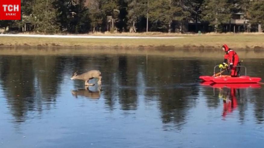 Спасатель освободил олененка, застрявшего посреди замерзшего озера. Это произошло в американском городе Санривер, штат Орегон. Животное забежало на середину озера, а выбраться назад не могло. Поэтому спасатель Дж. Дж. Джонстон с помощью специальных саней приблизился к олененку, и вытолкал его на берег.