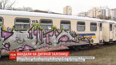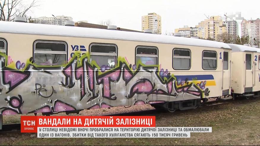Разрисовали детскую железную дорогу граффити и скрылись. В столице неизвестные ночью проникли на территорию детской железной дороги и обрисовали один из вагонов. Не остановил хулиганов ни высокий забор, ни колючая проволока. Работники говорят - эти вагоны только недавно обновили. Убытки от такого уличного творчества достигают 150 000 гривен.