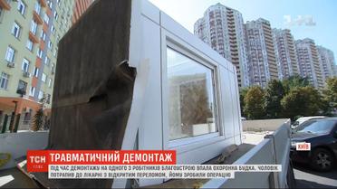 В одном из столичных районов рабочие благоустройства приехали к жилому комплексу с целью убрать забор, шлагбаум и охранную будку. Все это, говорят, установлен незаконно. Когда к будке прицепили тросы и начали поднимать, то она сорвалась прямо на одного из рабочих.