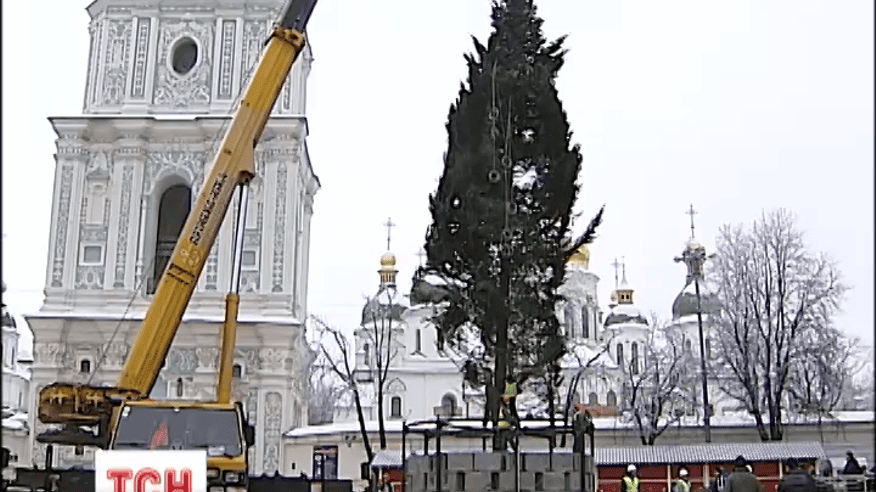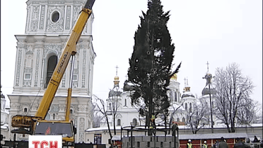 Впервые за время независимости - это настоящее целое дерево. Вес 12 тонн, высота 24 метра, возраст 82 года. Елку доставили из Прикарпатья - местная власть сделала столицы такой подарок.