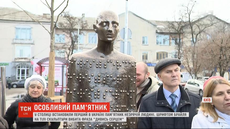 Двухметровый монумент разместили возле метро "Дарница". Металлическая скльптура с закрытыми глазами и тростью в руках будто идет по вырезанные из гранита - тактильной дорожке. Шрифтом Брайля на теле человека выбита фраза - "Смотри сердцем".