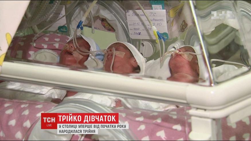 Три девочки появились на свет преждевременно. Они стали первой тройней в Киеве с начала года. Мама ждала их, а вот их папе о пополнении призналась уже в присутствии ТСН. Имена придумала только двум дочерям, а как назвать третью, еще колеблется.