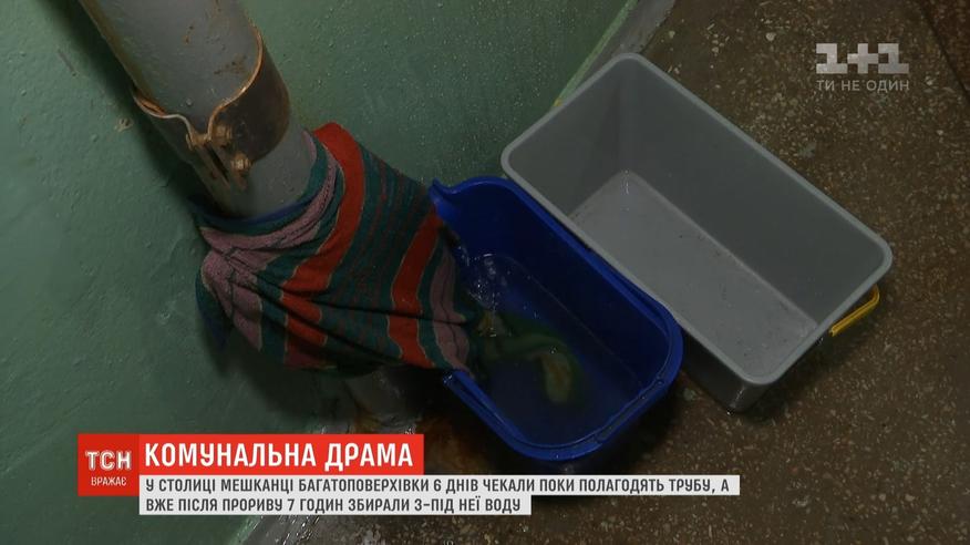 7 часов вприсядку с тряпками в руках и выливая воду, провели жители одной из многоэтажек столицы. Прорыв трубы произошел на 16 этаже. Вода начала заливать и нижние этажи. Сантехник появился тоже, но уже после звонка ТСН. А вот что труба неисправна, жители всюду сообщали еще на прошлой неделе. В коммунальной драме разбиралась ТСН.